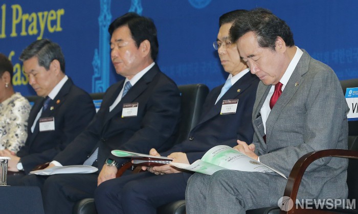 [서울=뉴스핌] 윤창빈 기자 = 이낙연 국무총리(오른쪽부터), 이영훈 여의도순복음교회 담임목사,김진표 더불어민주당 의원, 정경두 국방부장관이 17일 오전 서울 강남구 코엑스에서 열린 제51회 대한민국 국가조찬기도회에서 기도를 하고 있다. 2019.06.17 pangbin@newspim.com