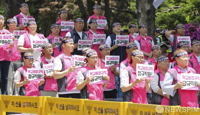 [서울=뉴스핌] 이한결 기자 = 17일 오전 서울 종로구 청와대 사랑채 옆에서 열린 ‘학교비정규직 여성노동자 100인 집단삭발식 및 대통령 공약이행 촉구 기자회견’에서 학교비정규직 100인이 피켓을 들고 있다. 2019.06.17 alwaysame@newspim.com