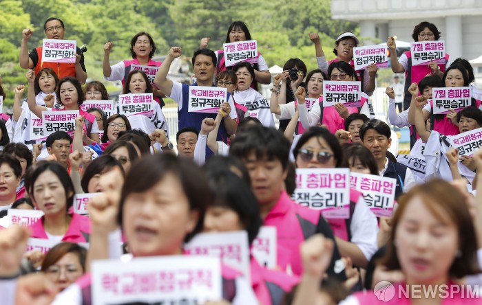 [서울=뉴스핌] 이한결 기자 = 17일 오전 서울 종로구 청와대 사랑채 옆에서 열린 ‘학교비정규직 여성노동자 100인 집단삭발식 및 대통령 공약이행 촉구 기자회견’에서 학교비정규직 100인이 구호를 외치고 있다. 2019.06.17 alwaysame@newspim.com