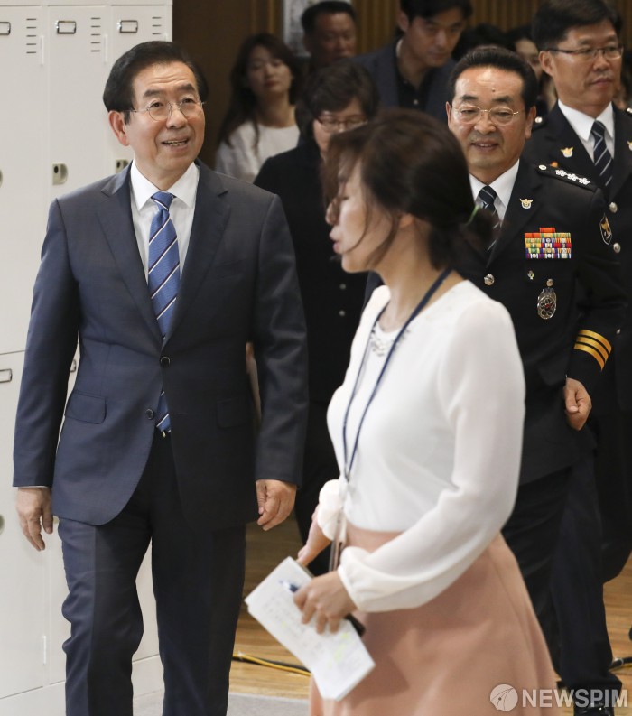 [서울=뉴스핌] 백인혁 기자 = 박원순 서울시장(왼쪽)과 원경환 서울지방경찰청장이 17일 오후 서울 중구 서울시청에서 열린 '불법촬영 함께점검 걱정없는 안심서울 선포식'에 참석하고 있다. 2019.06.17 dlsgur9757@newspim.com