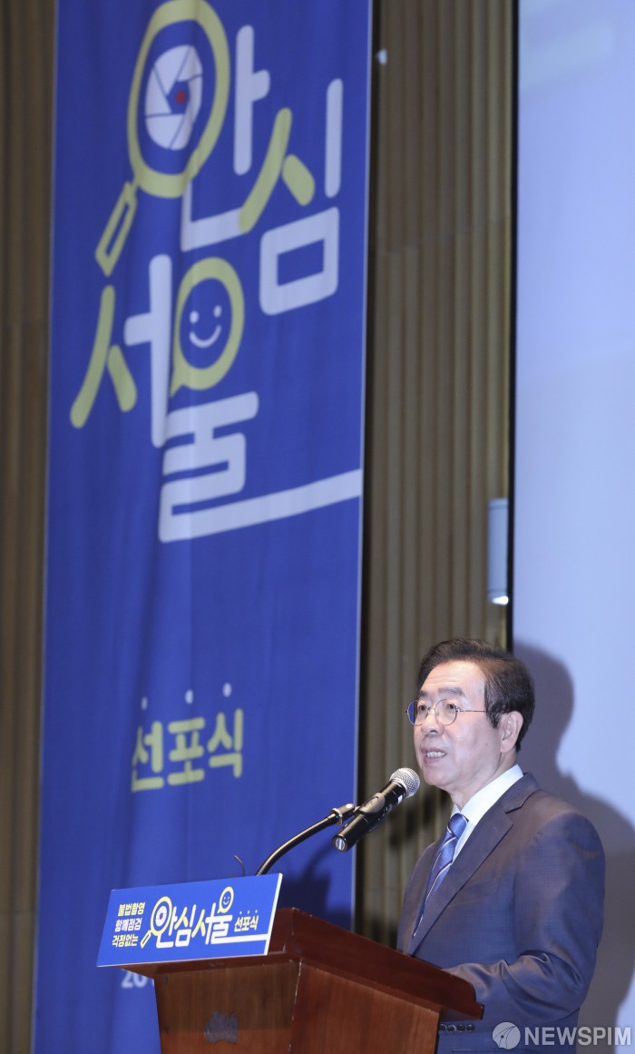 [서울=뉴스핌] 백인혁 기자 = 박원순 서울시장이 17일 오후 서울 중구 서울시청에서 열린 '불법촬영 함께점검 걱정없는 안심서울 선포식'에서 인사말을 하고 있다. 2019.06.17 dlsgur9757@newspim.com
