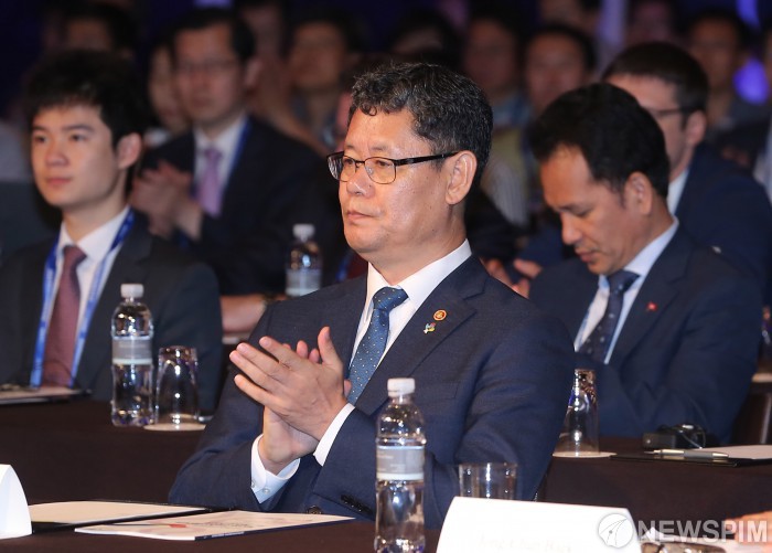 [서울=뉴스핌] 윤창빈 기자 = 김연철 통일부 장관이 19일 오전 서울 중구 웨스틴 조선호텔에서 열린 '2019 한반도국제평화포럼 : 함께 만들어가는 한반도 평화(KGFP2019 : Working Together for Peace in Korea)'에서 박수를 치고 있다. 2019.06.19 pangbin@newspim.com