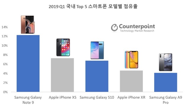 이에 올 1분기 판매량 상위 5 순위에는 삼성전자 제품 3개가 이름을 올렸다. 가장 많이 팔린 제품은 지난해 8월 출시된 갤럭시노트9이며 다음으로 갤럭시S10, 갤럭시A9프로 순이다.