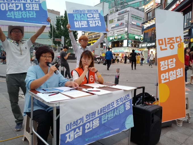 [수원=뉴스핌] 정은아 기자 = 민중당 수원시지역위원회(위원장 임은지)가 20일 저녁 수원역 광장에서 '이석기 의원 내란사건 재심 탄원 정당연설회'를 진행했다.