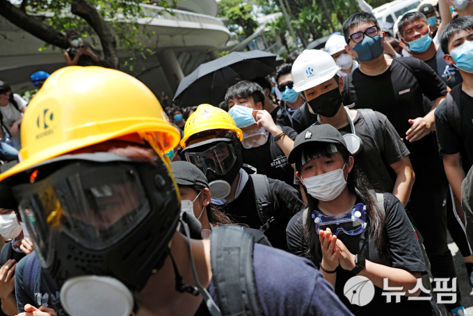 | [홍콩 로이터=뉴스핌] 최원진 기자= '범죄인 인도 법안' 철회와 캐리 람 행정장관(특별행정구 수반)의 사퇴를 촉구하는 홍콩 시민들이 안전모와 방독면 등을 쓴 채 경찰본부 건물 앞에 모였다. 2019.06.21. |