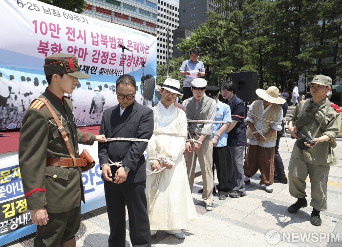 [서울=뉴스핌] 백인혁 기자 = 25일 오후 서울 중구 파이낸스 센터 앞에서 열린 '납북범죄 전문집단 규탄대회'에서 관계자들이 납북 장면 재연 퍼포먼스를 하고 있다. 2019.06.25 dlsgur9757@newspim.com