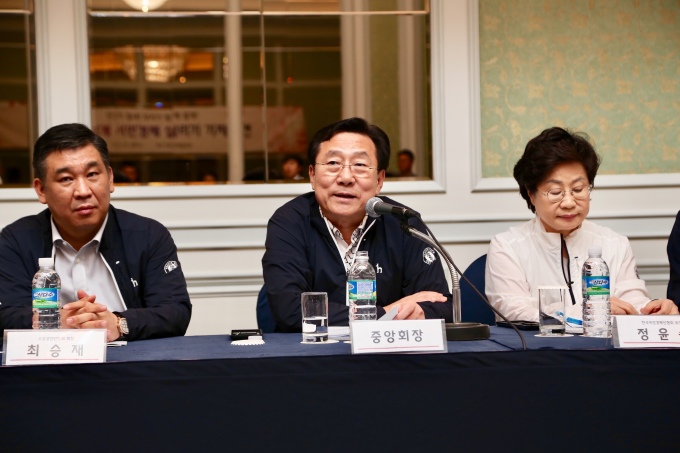 김기문(가운데) 중소기업중앙회장이 26일 제주 롯데호텔에서 진행된 '중소기업계 서민경제 살리기 기자회견'에서 최승재(왼쪽) 소상공인연합회장, 정윤숙 한국여성경제인협회장과 함께 캠페인 의의를 설명하고 있다. [사진=중소기업중앙회] |