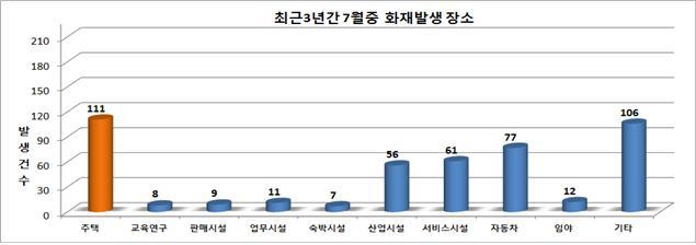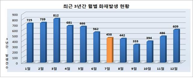 월별 화재발생 현황은 7월은 전체 6907건의 6.6%(458건)를 차지해 연 평균 576건보다 적게 발생했다.