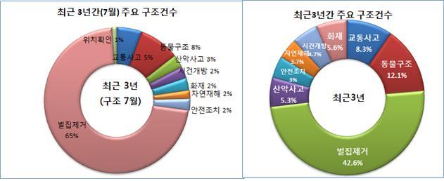 전체 구조출동 현황은 벌집제거가 42.6%(3만2914건)으로 가장 많은 비율을 차지하며, 동물구조 12.1%(9361건), 교통사고8.3%(6399건), 화재 5.6%(4314건), 산악사고 5.3%(4084건), 문 개방 4.7%(3622건) 기타 안전조치 3.9%(3004건) 둥의 순이었다.