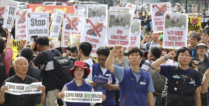 [서울=뉴스핌] 이한결 기자 = 도널드 트럼프 미국대통령의 방한이 예정된 29일 오후 서울 중구 서울광장에서 열린 ‘NO트럼프 범국민행동’에서 참가자들이 트럼프 대통령 방한 규탄 구호를 외치고 있다. 2019.06.29 alwaysame@newspim.com