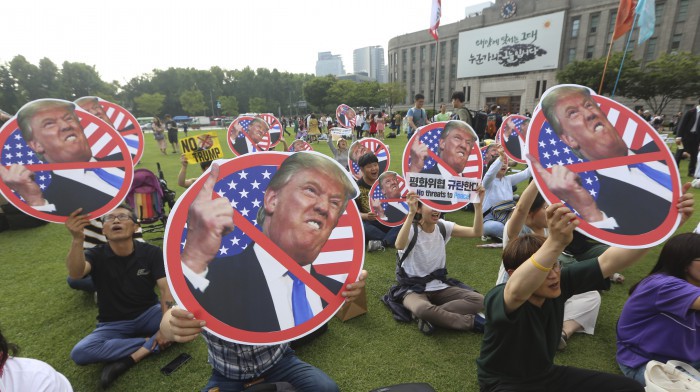 [서울=뉴스핌] 이한결 기자 = 도널드 트럼프 미국대통령의 방한이 예정된 29일 오후 서울 중구 서울광장에서 열린 ‘NO트럼프 범국민행동’에서 참가자들이 트럼프 대통령 방한 규탄 구호를 외치고 있다. 2019.06.29 alwaysame@newspim.com