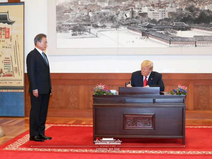 [서울= 뉴스핌] 문재인 대통령이 30일 청와대에서 한미 정상회담에 앞서 방명록에 서명하는 트럼프 대통령을 보고 있다. [사진=청와대 페이스북] 2019.6.30 photo@newspim.com