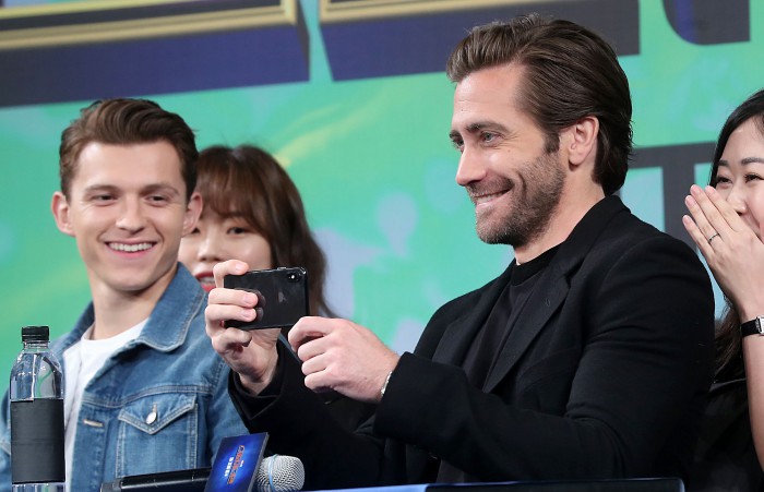 [서울=뉴스핌] 정일구 기자 = 배우 제이크 질렌할이 1일 오전 서울 광화문 포시즌스 호텔에서 열린 영화 '스파이더맨: 파 프롬 홈' 내한 기자회견에서 취재진을 카메라로 촬영하고 있다. '스파이더맨: 파 프롬 홈'은 '엔드게임' 이후 변화된 일상에서 벗어나 학교 친구들과 유럽 여행을 떠난 스파이더맨 피터 파커(톰 홀랜드)가 정체불명의 조력자 미스테리오(제이크 질렌할)와 세상을 위협하는 새로운 빌런들을 만나면서 벌어지는 이야기를 그린 마블 액션 블록버스터다. 2019.07.01 mironj19@newspim.com