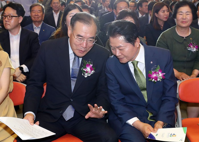 [서울=뉴스핌] 정일구 기자 = 이개호 농림축산식품부 장관과 김병원 농협중앙회장이 1일 오전 서울 중구 농협중앙회에서 열린 농협창립 58주년 기념식에서 대화를 하고 있다. 2019.07.01 mironj19@newspim.com