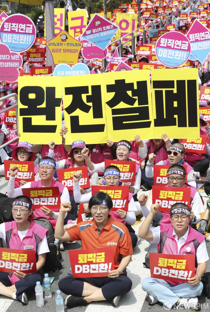 [서울=뉴스핌] 이형석 기자 = 총 파업에 돌입한 전국학교비정규직노조가 3일 오전 서울 종로구 교육청 앞에서 피켓을 들고 구호를 외치고 있다. 2019.07.03 leehs@newspim.com