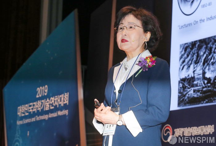 [서울=뉴스핌] 윤창빈 기자 = 김명자 한국과학기술총연합회 회장이 4일 오전 서울 강남구 코엑스에서 열린 2019 대한민국과학기술연차대회에서 오프닝 연설을 하고 있다. 2019.07.04 pangbin@newspim.com