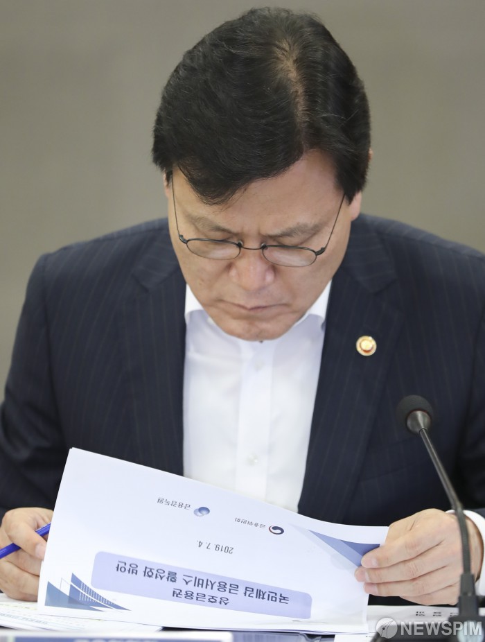 [서울=뉴스핌] 이한결 기자 = 최종구 금융위원회 위원장이 4일 오전 서울 중구 농협중앙회 중앙본부에서 열린 ‘상호금융권 국민체감 금융서비스 활성화 간담회’에 참석해 자료를 보고 있다. 2019.07.04 alwaysame@newspim.com