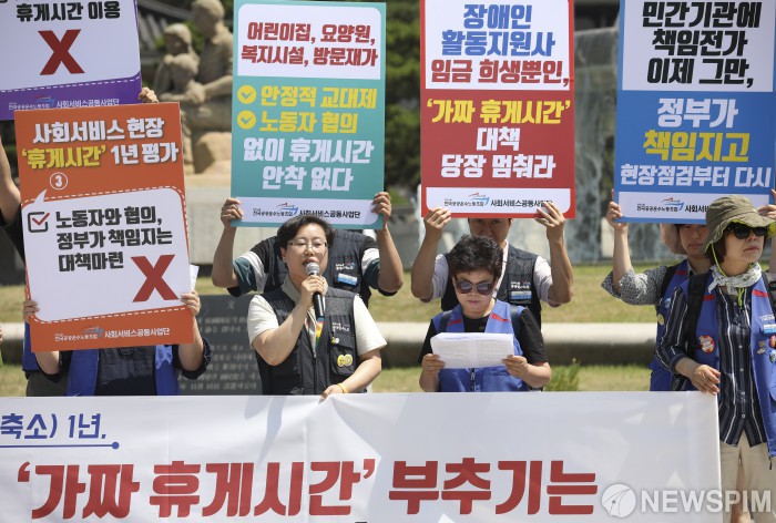 [서울=뉴스핌] 백인혁 기자 = 서진숙 공공운수노조 부위원장 및 사회서비스공동사업단장이 4일 오전 서울 종로구 청와대 앞 분수대에서 열린 근기법개정 1년 사회서비스 '가짜 휴게시간' 부추기는 정부대책 규탄 기자회견에서 발언하고 있다. 2019.07.04 dlsgur9757@newspim.com