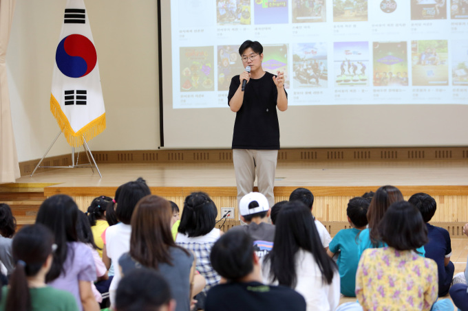 | 나영석 PD가 4일 인제 귀둔초등학교에서 ‘나의 살던 고향은’을 주제로 학생, 학부모, 지역주민 등을 대상으로 무료 특강을 진행했다.[사진=인제군] |
