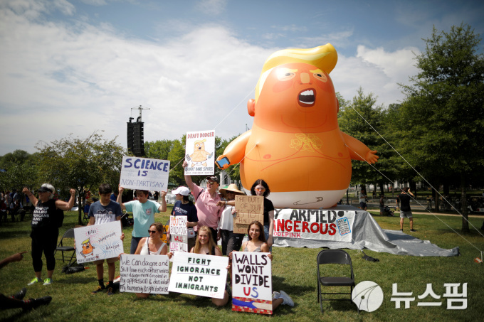 | [워싱턴 로이터=뉴스핌] 이홍규 기자 = 미국 독립기념일 축하행사가 열린 워싱턴DC에서 도널드 트럼프 미국 대통령에 반대하는 시민들이 '베이비 트럼프' 풍선을 뒤에 두고 시위를 하고 있다. 2019.07.04. |