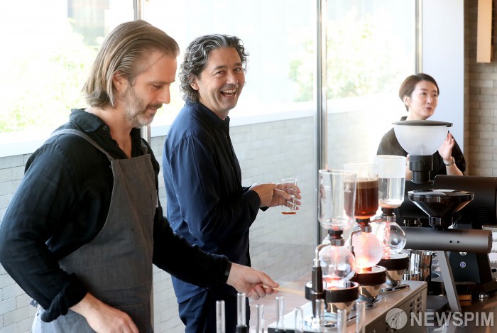 [서울=뉴스핌] 정일구 기자 = 블루보틀커피코리아가 2호점을 오픈한 5일 오전 서울 종로구 블루보틀 삼청점에서 브라이언 미한 블루보틀 CEO가 취재진과 인터뷰를 하고 있다. 2019.07.05 mironj19@newspim.com