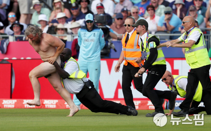 | [체스터 르 스트리트=뉴스핌] 박우진 기자 = 3일(현지시간) 영국 체스터 르 스트리트에서 열린 잉글랜드와 뉴질랜드의 크리켓 월드컵 경기 도중에 한 관객이 경기장으로 난입하자 경기장 진행요원이 관객을 붙잡고 있다. 2019.07.03 |