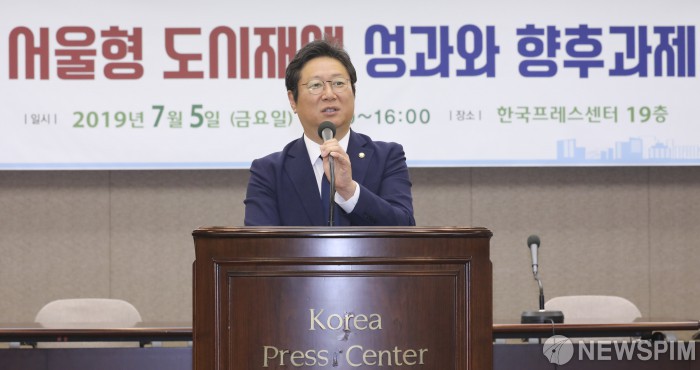 [서울=뉴스핌] 이한결 기자 = 황희 더불어민주당 의원이 5일 오후 서울 중구 한국프레스센터에서 열린 ‘서울형 도시재생 성과와 향후과제’ 도시재생 토론회에서 축사를 하고 있다. 2019.07.05 alwaysame@newspim.com