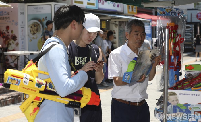 [서울=뉴스핌] 백인혁 기자 = 6일 오후 서울 서대문구 연세로 일대에서 열린 '2019 신촌 물총 축제'에서 한 시민이 물총을 구매 하고 있다. 해마다 새로운 컨셉으로 변화하는 신촌 물총축제는 내일(7일)까지 개최 된다. 2019.07.06 dlsgur9757@newspim.com