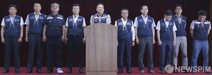 [서울=뉴스핌] 이한결 기자 = 이동호 전국우정노동조합(우정노조) 위원장이 8일 오후 서울 종로구 광화문우체국에서 열린 우정노조 총파업 관련 기자회견에서 노조본부·지방위원장 회의를 통해 결정된 파업 여부를 최종적으로 밝히고 있다. 2019.07.08 alwaysame@newspim.com