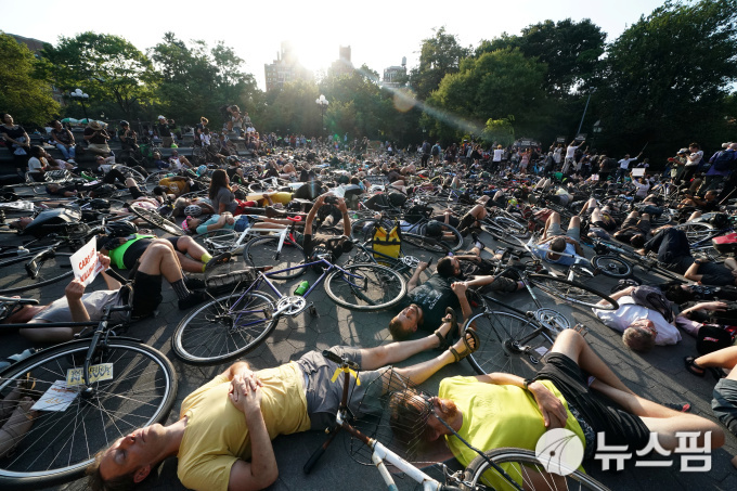 | [뉴욕 로이터=뉴스핌] 백지현 기자 = 9일(현지시간) 미국 뉴욕주 뉴욕시 맨해튼에서 시민들이 자전거 사고에 대한 경각심을 불러 일으키기 위해 자전거와 함께 누워 '다이 인'(Die in) 시위를 벌이고 있다. 시위대는 매년 증가하는 자동차와 자전거의 충돌사고에 대한 시 당국의 조처를 요구하고 있다. 2019.07.09 |