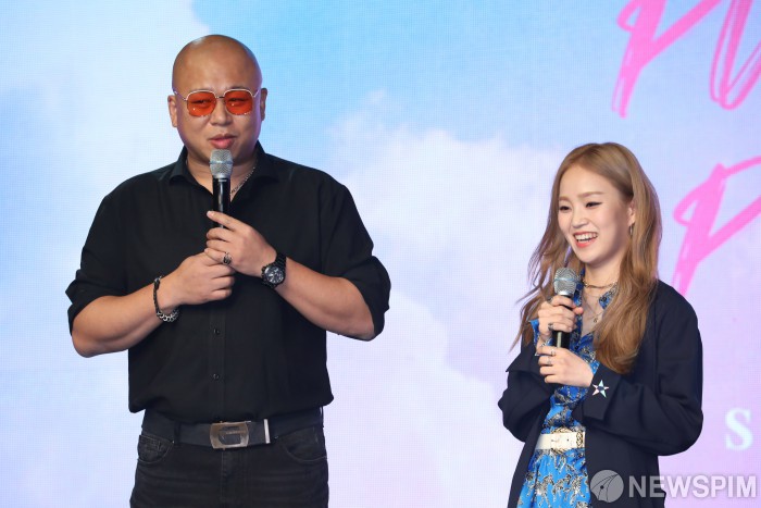 [서울=뉴스핌] 백인혁 기자 = 작곡가 돈스파이크(왼쪽)가 11일 오후 서울 강남구 일지아트홀에서 열린 '애런 데뷔 쇼케이스'에서 가수 애런에게 응원을 보내고 있다. 2019.07.11 dlsgur9757@newspim.com