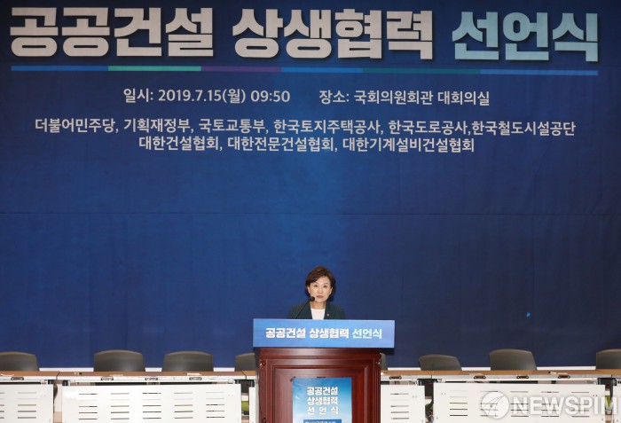 [서울=뉴스핌] 백인혁 기자 = 김현미 국토교통부 장관이 15일 오전 서울 여의도 국회 의원회관에서 열린 '공공건설 상생협력 선언식' 에서 인사말을 하고 있다. 2019.7.15 dlsgur9757@newspim.com