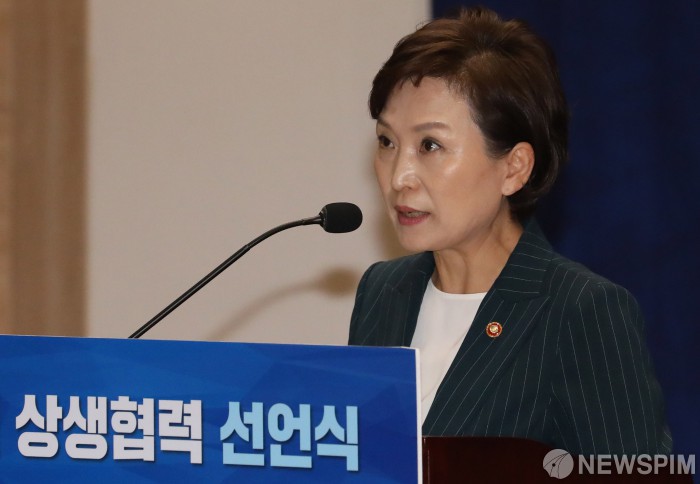 [서울=뉴스핌] 백인혁 기자 = 김현미 국토교통부 장관이 15일 오전 서울 여의도 국회 의원회관에서 열린 '공공건설 상생협력 선언식' 에서 인사말을 하고 있다. 2019.7.15 dlsgur9757@newspim.com
