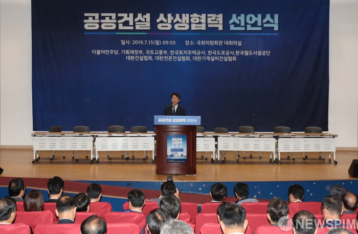 [서울=뉴스핌] 백인혁 기자 = 이인영 더불어민주당 원내대표가 15일 오전 서울 여의도 국회 의원회관에서 열린 '공공건설 상생협력 선언식' 에서 인사말을 하고 있다. 2019.7.15 dlsgur9757@newspim.com