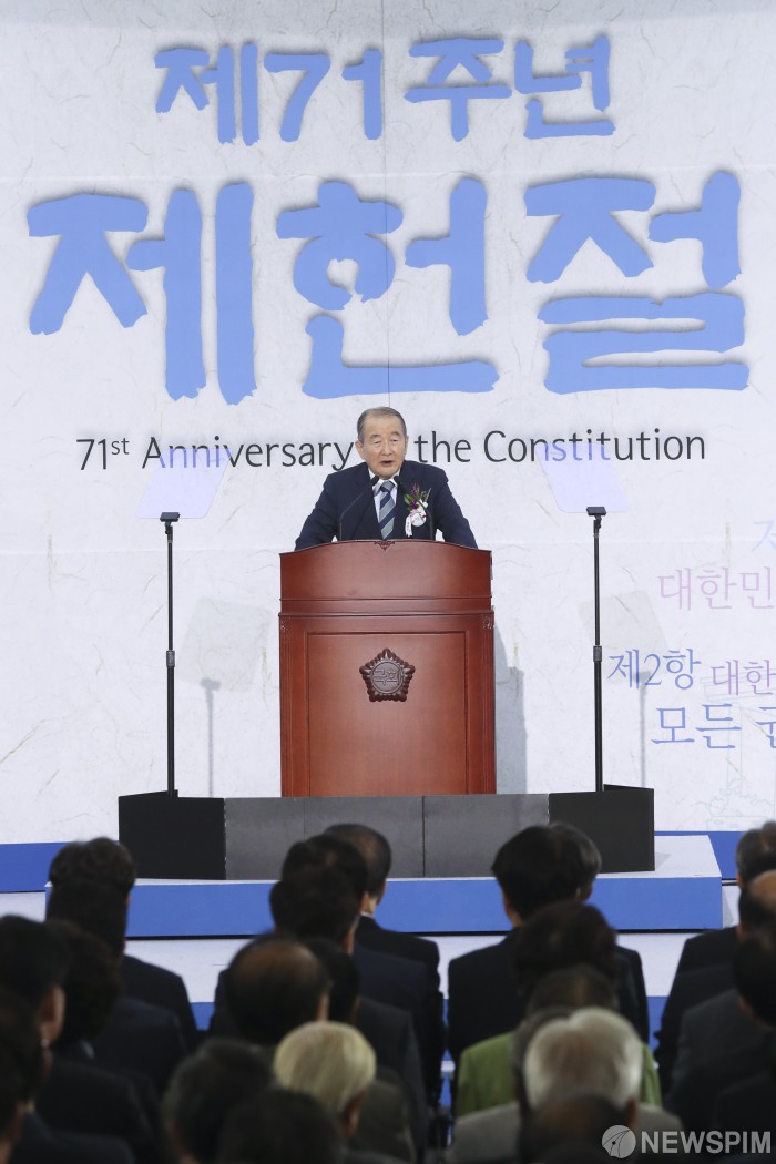 [서울=뉴스핌] 이형석 기자 = 유경현 대한민국헌정회장이 17일 오전 서울 여의도 국회에서 열린 제71주년 제헌절 경축식에서 기념사를 하고 있다. 2019.07.17 leehs@newspim.com