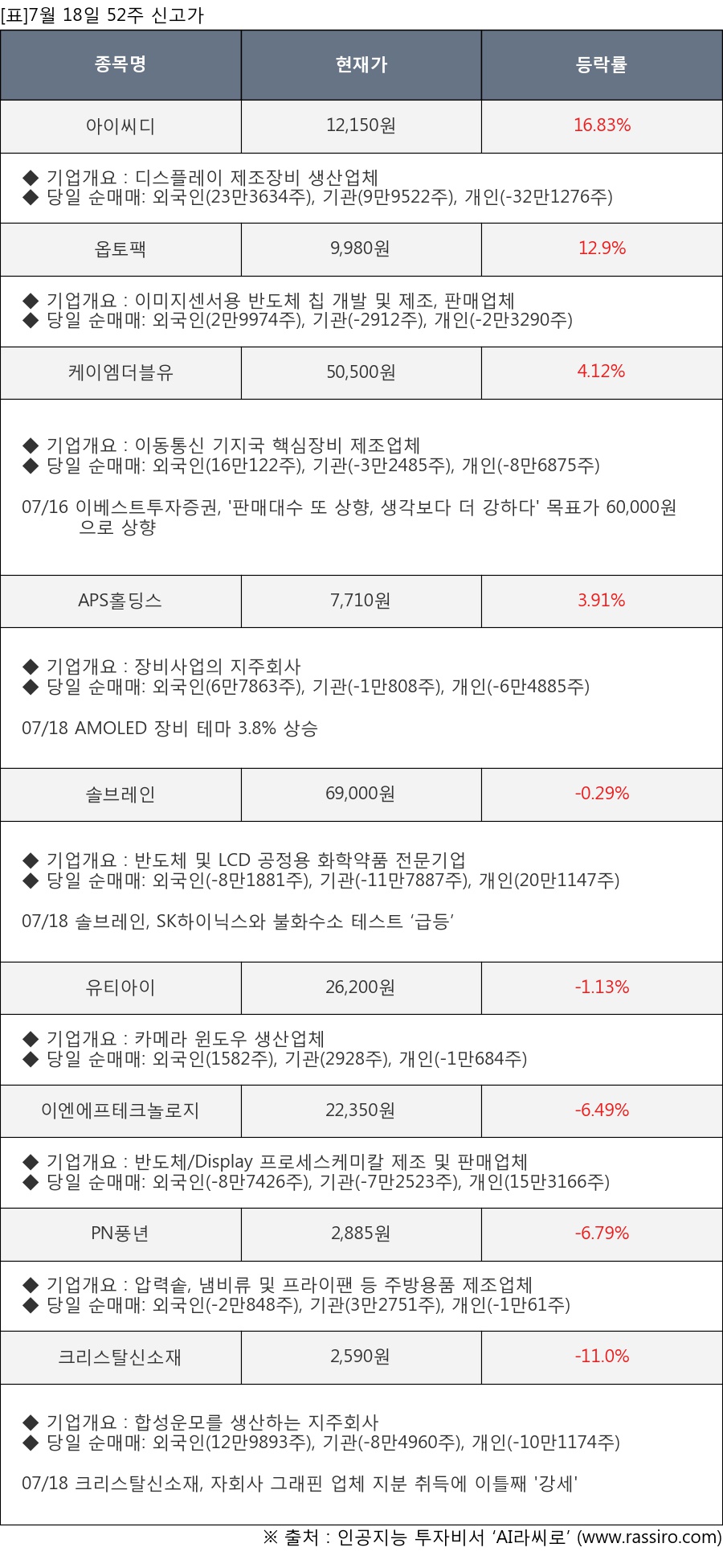 ※ 관련 종목: 아이씨디, 옵토팩, 케이엠더블유, APS홀딩스, 솔브레인, 유티아이, 이엔에프테크놀로지, PN풍년, 크리스탈신소재