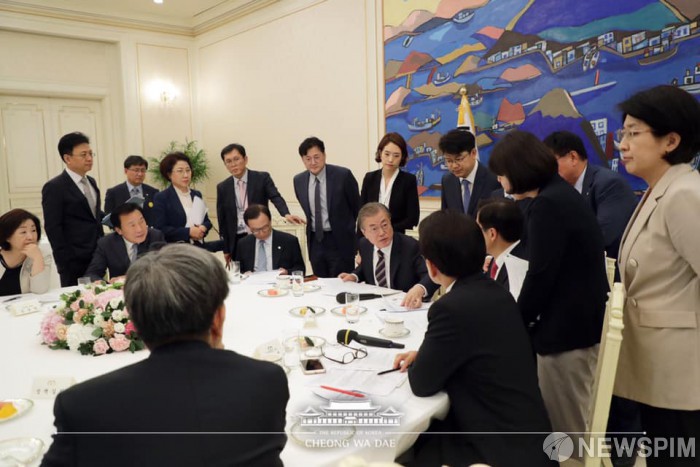 [서울=뉴스핌] 문재인 대통령이 18일 오후 청와대에서 열린 '정당대표 초청 대화'에서 여야 5당 대표들과 합의문에대해 논의하고 있다.[사진=청와대페이스북] 2019.07.18 photo@newspim.com