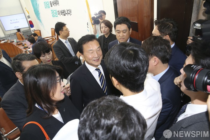 [서울=뉴스핌] 이형석 기자 = 단식 11일째를 이어가는 권성주 바른미래당 혁신위원이 22일 오전 서울 여의도 국회에서 최고위원회의를 마치고 나서는 손학규 대표를 막아 서고 있다. 2019.07.22 leehs@newspim.com