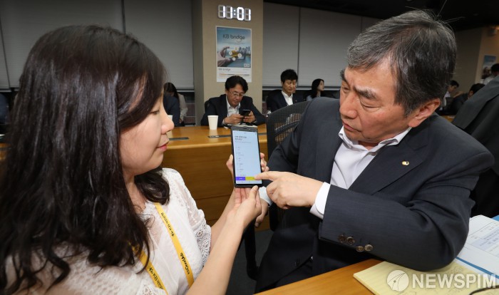 [서울=뉴스핌] 백인혁 기자 = 윤석헌 금융감독원장이 24일 오전 서울 영등포구 KB국민은행 본점에서 열린 자영업자·중소기업 상생지원을 위한 '모바일 플랫폼' (KB Bridge) 시연 및 간담회에서 KB bridge를 체험하고 있다. 2019.07.24 dlsgur9757@newspim.com