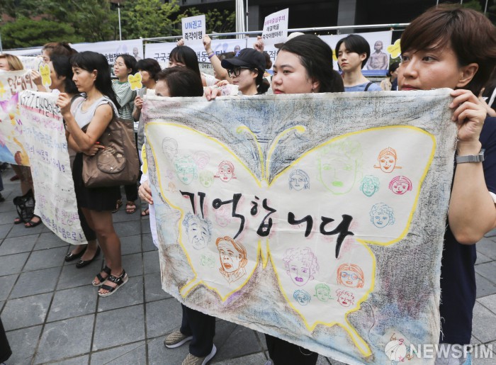 [서울=뉴스핌] 이한결 기자 = 24일 오전 서울 종로구 옛 일본대사관 앞에서 정의기억연대와 ‘보따리전’ 주최로 열린 ‘일본군 ‘위안부’ 피해자들의 인권회복 활동 방해하는 일본정부 규탄 기자회견’에서 참가자들이 구호가 적힌 '보따리'를 들고 있다. 2019.07.24 alwaysame@newspim.com
