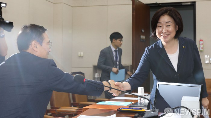 [서울=뉴스핌] 최상수 기자 = 25일 오후 서울 여의도 국회에서 열린 정치개혁특별위원회 전체회의에서 홍영표 위원장과 심상정 정의당 의원이 악수를 나누고 있다. 2019.07.25 kilroy023@newspim.com