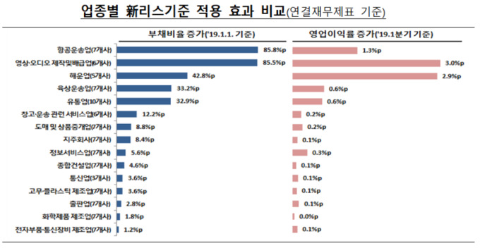 항공기 운용리스 관련 부채 인식으로 항공운송업에 속한 기업의 부채비율이 평균 85.8%p에서 최대 238.6%p까지 증가했다. 해운업은 선박 운용리스 비중에 따라 기업별 차이가 있어 평균 42.8%p 상승한 가운데, 그 비중이 높은 기업의 부채비율은 최대 189.0%p까지 늘었다.