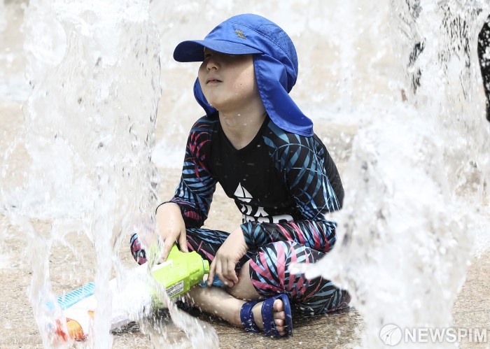 [서울=뉴스핌] 이한결 기자 = 서울·경기·강원·충북·충남·전남 지역에 폭염경보가 내려진 2일 오후 서울 중구 서울광장 분수대에서 어린이들이 무더위를 피해 물놀이를 즐기고 있다. 2019.08.02 alwaysame@newspim.com