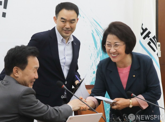 [서울=뉴스핌] 최상수 기자 = 손학규 바른미래당 대표, 최도자 수석대변인이 5일 오전 서울 여의도 국회에서 열린 최고위원회의에서 악수를 나누고 있다. 2019.08.05 kilroy023@newspim.com