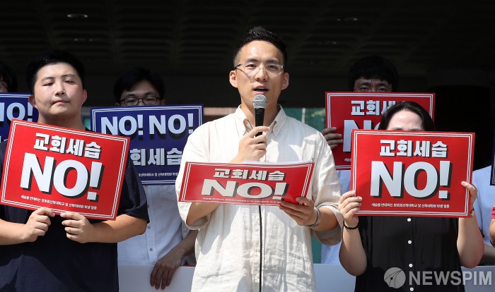 [서울=뉴스핌] 정일구 기자 = 장로회신학대학교 세습반대TF 관계자들이 5일 오전 서울 종로구 한국교회 100주년 기념관 앞에서 명성교회 세습반대와 총회의 공정한 재판 촉구를 위한 기자회견을 하고 있다. 2019.08.05 mironj19@newspim.com