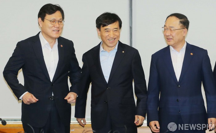 [서울=뉴스핌] 윤창빈 기자 = 최종구 금융위원회 위원장(왼쪽부터), 이주열 한국은행 총재, 홍남기 경제부총리 겸 기획재정부 장관이 7일 오전 서울 중구 은행회관에서 열린 긴급 거시경제금융회의에서 기념촬영을 하기 전 미소를 짓고 있다. 2019.08.07 pangbin@newspim.com