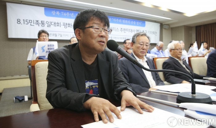 [서울=뉴스핌] 이형석 기자 = 자주와 평화를 위한 8.15민족통일대회‧평화손잡기 추진위원회가 7일 오전 서울 중구 프레스센터에서 열린 ‘8.15민족통일대회‧평화손잡기 개최 및 해리 해리스 주한미대사 면담 촉구 기자회견’을 열고 있다. 2019.08.07 leehs@newspim.com