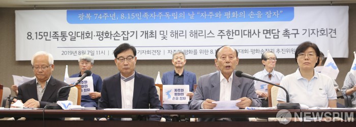 [서울=뉴스핌] 이형석 기자 = 자주와 평화를 위한 8.15민족통일대회‧평화손잡기 추진위원회가 7일 오전 서울 중구 프레스센터에서 열린 ‘8.15민족통일대회‧평화손잡기 개최 및 해리 해리스 주한미대사 면담 촉구 기자회견’을 열고 있다. 2019.08.07 leehs@newspim.com