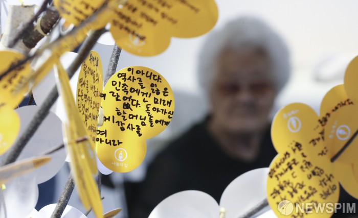 [서울=뉴스핌] 이형석 기자 = 8일 오후 서울 종로구 갤러리 이즈에서 열린 ‘할머니의 내일 展'에서 관람객들 남긴 메시지가 나무에 걸려 있다. 사진전 ‘할머니의 내일 展'은 오는 20일까지 열린다. 2019.08.08 leehs@newspim.com