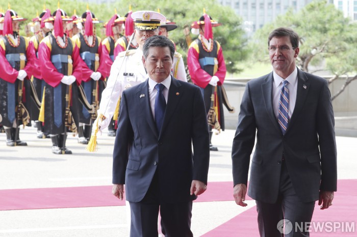 [서울=뉴스핌] 이형석 기자 = 정경두 국방부장관이 9일 서울 용산구 국방부청사 입구에서 마크 에스퍼 미국 국방부장관을 맞이하고 있다. 2019.08.09 leehs@newspim.com